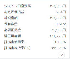 2Lotも保有してしまうと、おそらく300%を切ってしまうので、危険領域に入ると認識しており、そこまで保有しないように、自動売買を調整しながら取り組んでいます。